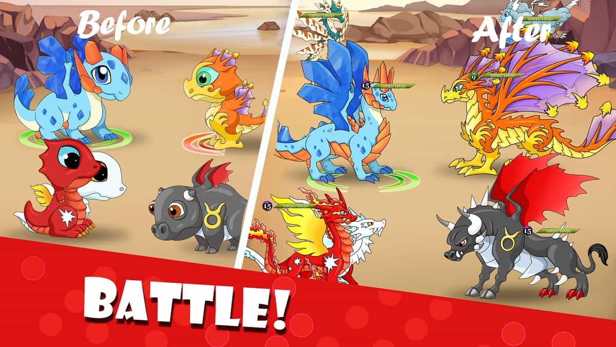 Dragon Battle cho phép bạn xây dựng một đội hình rồng mạnh mẽ để tham gia vào các trận đấu chiến đấu và thách thức. Bạn sẽ nhập vai vào một người huấn luyện rồng tài ba. Nhiệm vụ của bạn là chăm sóc, rèn luyện và phát triển những con rồng của mình. Mỗi loài rồng trong trò chơi có đặc điểm riêng. Bao gồm sức mạnh, kỹ năng và khả năng đặc biệt. Bạn cần tìm hiểu và tìm cách tận dụng những điểm mạnh của từng loài để xây dựng một đội hình đa dạng và cân bằng. Bằng cách rèn luyện rồng thông qua các hoạt động như thi đấu, nhiệm vụ và khám phá. Bạn có thể nâng cao cấp độ, kỹ năng và sức mạnh của chúng. Không chỉ là việc rèn luyện về sức mạnh. Bạn cũng cần chăm sóc và tạo dựng mối quan hệ thân thiết với các con rồng. Đáp ứng các nhu cầu của chúng, tạo môi trường sống tốt. Cùng với đó là tìm hiểu tính cách của từng con để tạo ra một liên kết đặc biệt.